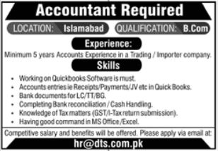 Vacant posts including accountant are announced in Dynamic Tooling Services DTS Islamabad Pakistan as per 13 February 2022 advertisement in daily Jang Newspaper. Candidates with M.com etc. educational background will be preferred.