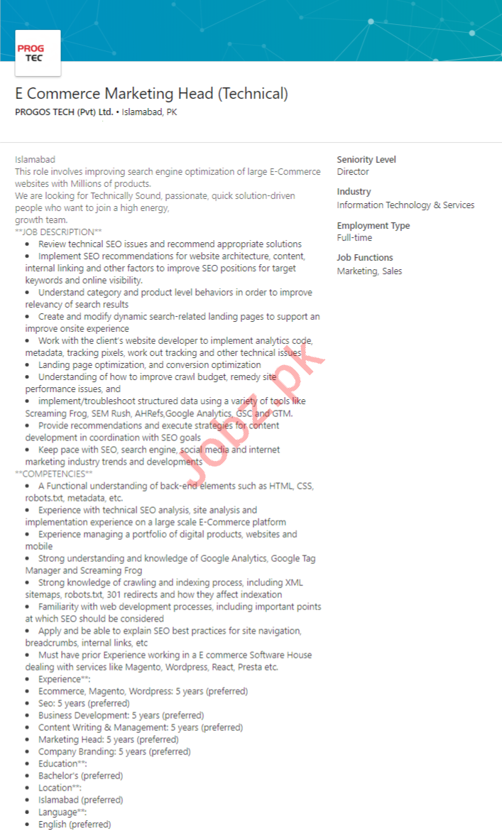 Latest Progos Tech Pvt Ltd Management Posts Islamabad 2025
