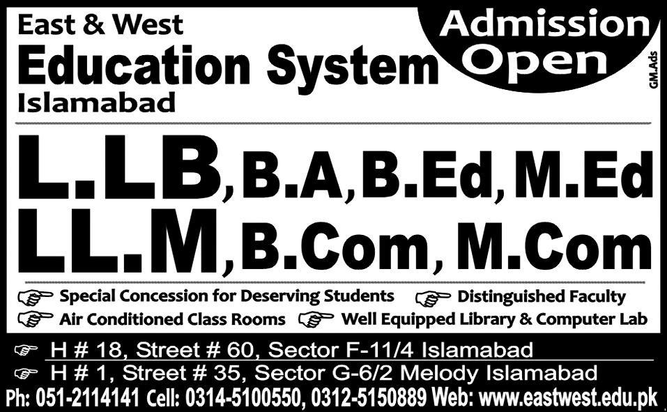 East & West Education System Admission in LLB, BA, B.Ed, M.Ed, LLM, B.Com and M.Com in Islamabad. Read newspaper ad for exact details.