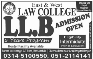 East & West Law College affiliated with Punjab University Hazara University has announced admissions in Bachelor of Laws LLB 5 Years Degree Programs in Haripur KPK. Read newspaper ad for exact details.