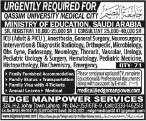 Edge Manpower Services, Qassim University Medical City, Ministry of Education jobs advertisement dated about 13 March 2022 in daily Jang Newspaper invites application for the vacant post of endoscopy, general surgery, microbiology, obs gyne, anesthesia, registrar, orthopedic, neurosurgery and consultant in Saudi Arabia, saudi arabia Saudi Arabia. Candidates with Phd, MBBS and Mphil etc. educational background will be preferred.