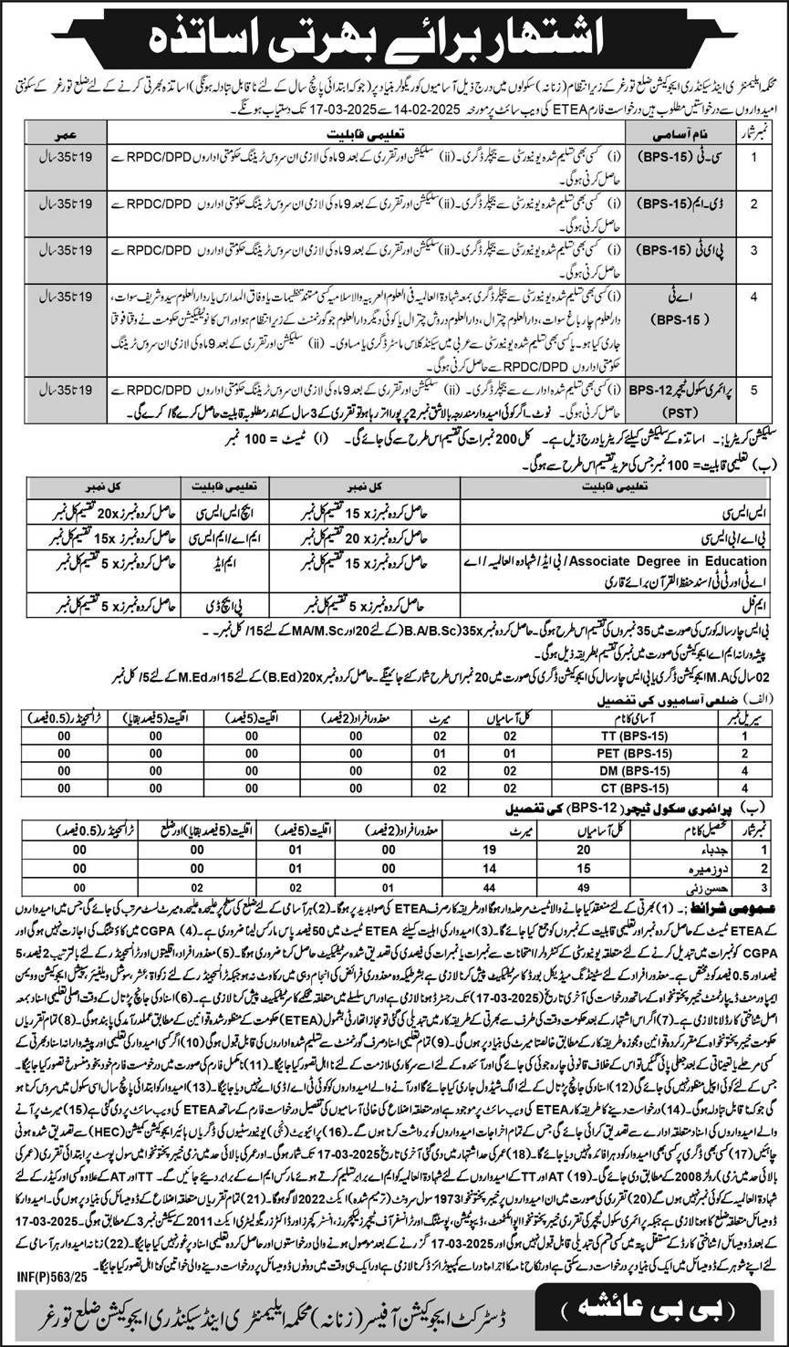 Elementary and Secondary Education Department ESED jobs advertisement dated about 14 February 2025 in daily Express Newspaper invites application for the vacant post of pst, ct, ct teacher, primary school teacher, pet teacher, pet, pst teacher, at, at teacher, dm teacher, dm and teacher in Torghar, torghar Khyber Pakhtunkhwa KPK Pakistan. Educational qualifications required M.ed, Mphil, B.ed, BA, Master, Phd, M.sc, Bachelor and MA etc.