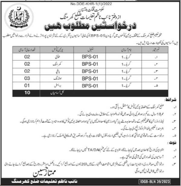 Education Department Ghurmang Gilgit jobs advertisement dated about 25 January 2023 in daily K2 Newspaper invites application for the vacant post of grade i in Gilgit, gilgit Gilgit Baltistan Pakistan. Candidates with Middle and Primary etc. educational background will be preferred.