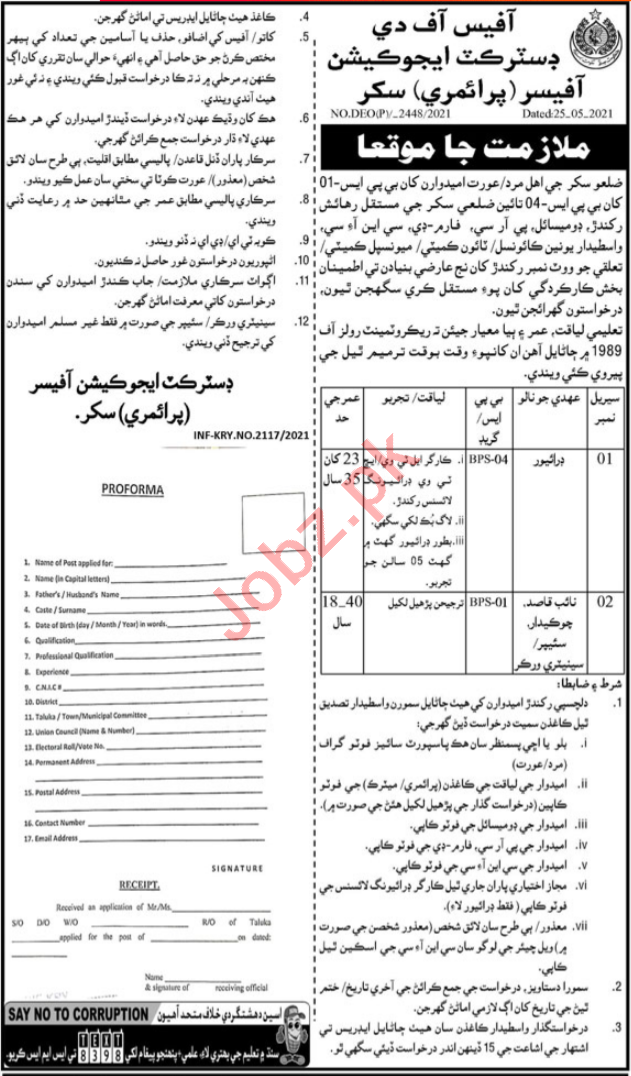 Education Department Primary Sukkur Jobs 2021 For Naib Qasid