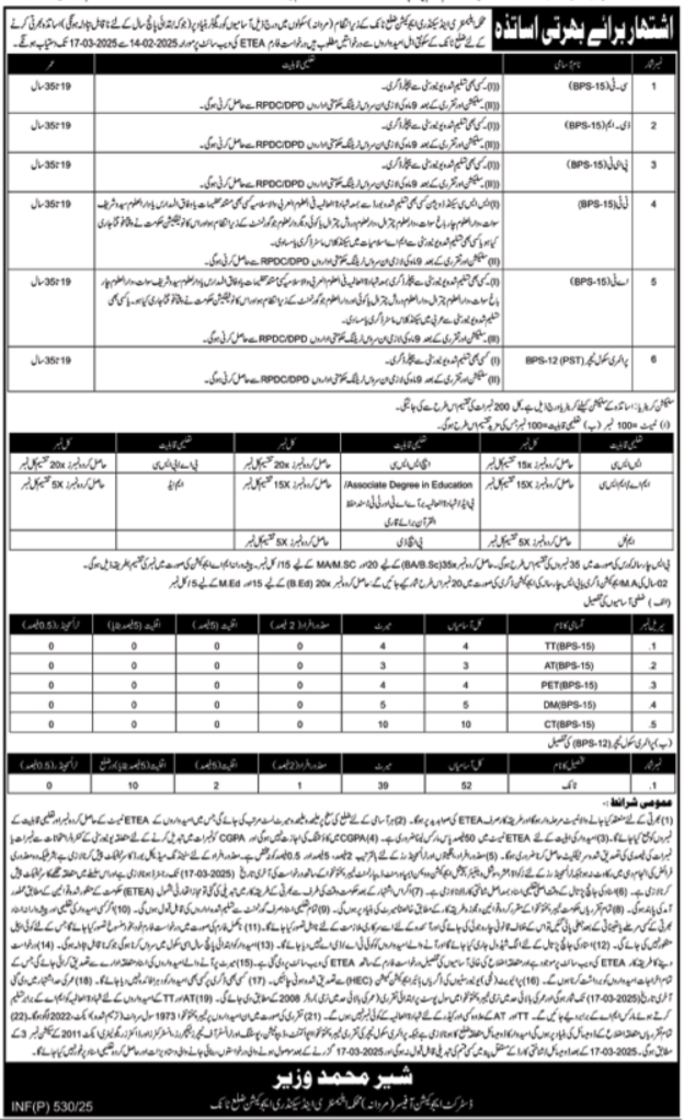 Elementary and Secondary Education Department ESED Tank, tank Khyber Pakhtunkhwa KPK Pakistan invites applications from eligible candidates for the post of teacher, dm teacher, at, pet, ct, at teacher, ct teacher, pet teacher, tt, tt teacher, primary school teacher and dm as per advertisement of February 13, 2025 published in daily Ausaf Newspaper. Persons with MS, Master, B.ed, M.ed, MA, Phd, Mphil, M.sc, Bachelor and BA etc. education can apply.