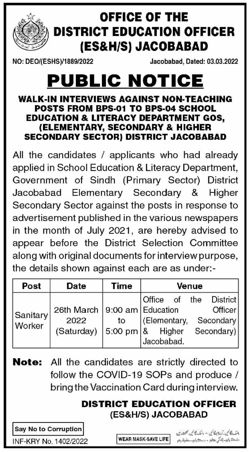 District Education Officer invites applications for job positions advertised in daily Dawn dated 19 March 2022 for following vacancies in Jacobabad, jacobabad Sindh Pakistan.