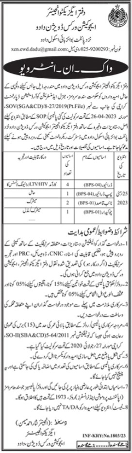 Education Works Division Dadu, dadu Sindh Pakistan invites applications from eligible candidates for the post of naib qasid, ltv driver, pump driver, chowkidar, htv driver and driver as per advertisement of May 14, 2023 published in daily Jang Newspaper. Educational qualifications required Middle, Matric and Primary etc.
