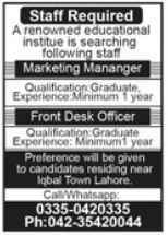 Educational Institute jobs advertisement dated about 6 February 2022 in daily Jang Newspaper invites application for the vacant post of Marketing Manager and Front Desk Officer in Lahore Punjab Pakistan. Candidates with Bachelor etc. educational background will be preferred.