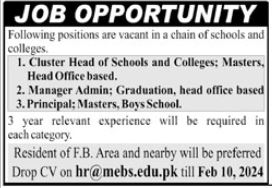 Educational Institute jobs advertisement dated about 21 January 2024 in daily Jang Newspaper invites application for the vacant post of manager admin, cluster head of schools and principal in Karachi, karachi Sindh Pakistan. Candidates with Bachelor and Master etc. educational background will be preferred.
