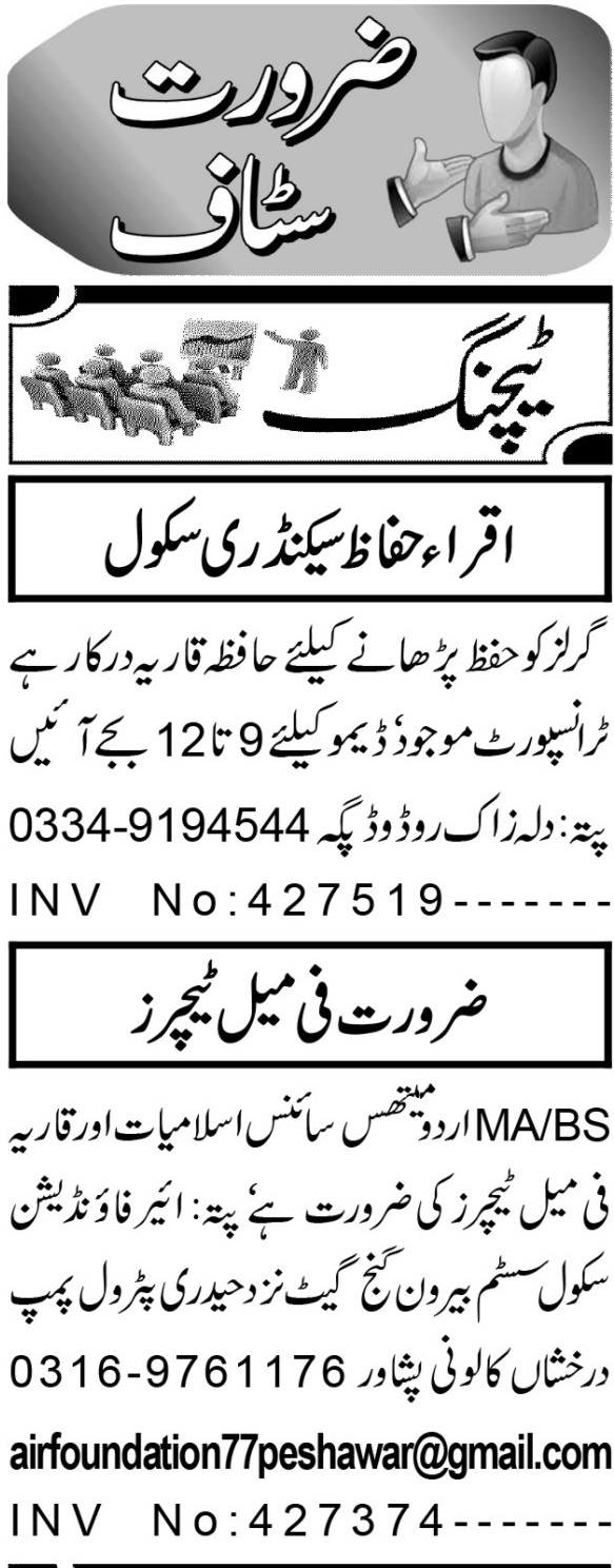 Educational Institute jobs advertisement dated about 19 December 2023 in daily Aaj Newspaper invites application for the vacant post of math teacher, science teacher, female teacher, male teacher, qaria and islamiyat teacher in Peshawar, peshawar Khyber Pakhtunkhwa KPK Pakistan. M.sc, MA, Master, MS and Bachelor etc. educational qualification will be preferred.