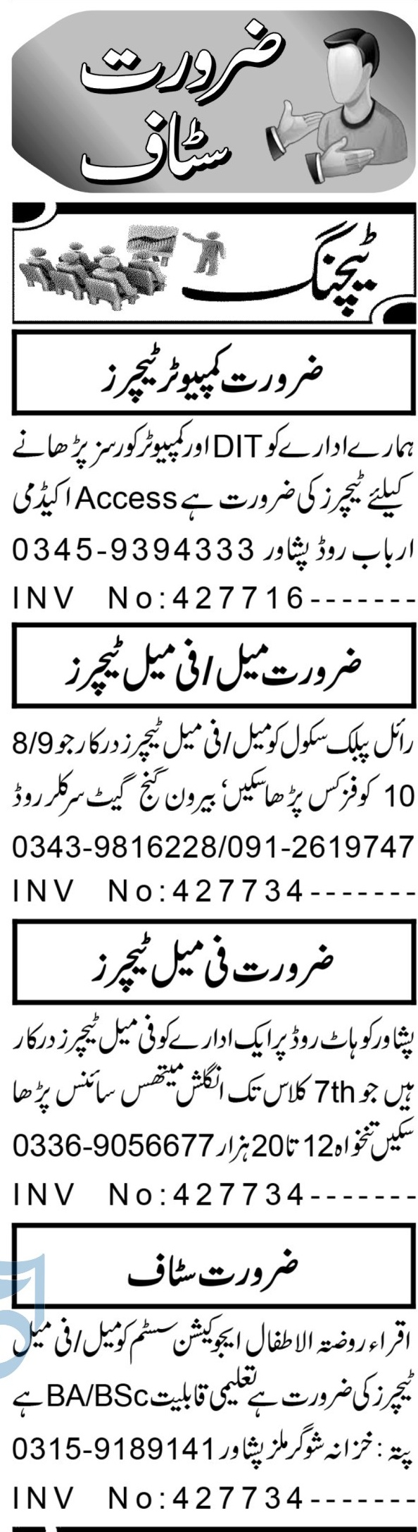 Educational Institute jobs advertisement dated about 28 December 2023 in daily Aaj Newspaper invites application for the vacant post of female teacher, math teacher, english teacher, computer teacher, male teacher, science teacher and physics teacher in Peshawar, peshawar Khyber Pakhtunkhwa KPK Pakistan. Educational qualifications required M.sc, Master, MS, MA and Bachelor etc.