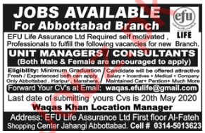 Efu Life Assurance Abbottabad Jobs For Managers & Consultant