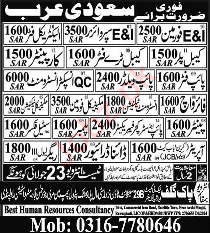 Best Human Resources Consultancy is looking for candidates for following posts as per job advertisement published in daily Express Newspaper of July 21, 2024 for location Riyadh, riyadh Saudi Arabia: