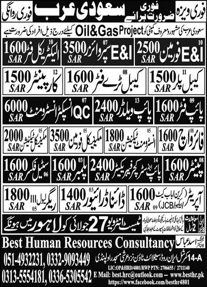 Best Human Resources Consultancy Riyadh, riyadh Saudi Arabia invites applications from eligible candidates for the post of painter, fire watch, steel fixer, electrical fitter, pipe structure fabricator, qc inspector instrument, operator, instrument technician, ei supervisor, pipe welder, ei foreman, cable tray fitter, mechanical technician, diana driver, mechanical foreman, plumber, rigger, pipe fitter, cable puller and carpenter as per advertisement of July 23, 2024 published in daily Express Newspaper. Candidates with Bachelor, Matric, Middle and Intermediate etc. educational background will be preferred.