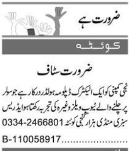 Factory Quetta, quetta Balochistan Pakistan invites applications from eligible candidates for the post of electrician and electric diploma holder as per advertisement of February 13, 2025 published in daily Express Newspaper. Educational qualifications required Matric and Intermediate etc.