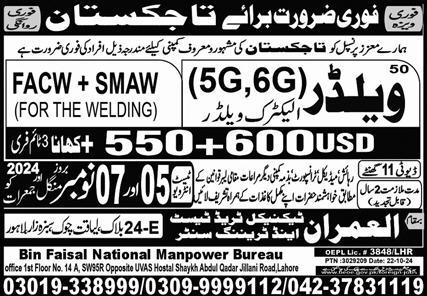 Bin Faisal National Manpower Bureau invites applications for job positions advertised in daily Express dated 2 November 2024 for following vacancies in Dushanbe, dushanbe Tajikistan.