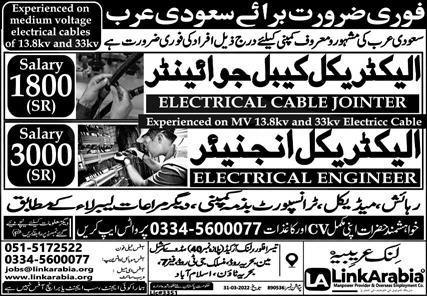 Link Arabia Overseas Recruitment Company Dammam, dammam Saudi Arabia invites applications from eligible candidates for the post of electrical cable jointer, electrical engineer and engineer as per advertisement of April 4, 2022 published in daily Express Newspaper. Preferred Education is Intermediate and Bachelor etc.
