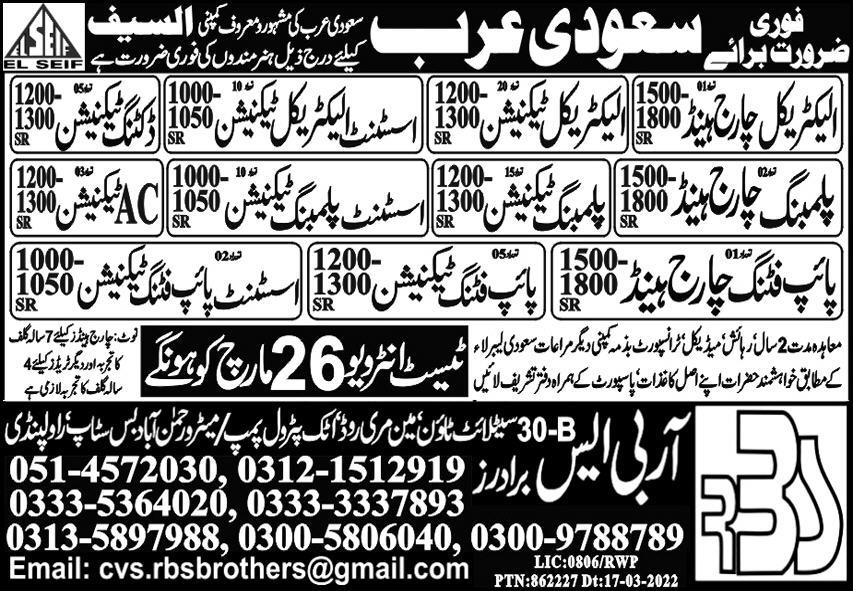 RBS Brothers is looking for candidates for following posts as per job advertisement published in daily Express Newspaper of March 19, 2022 for location Riyadh, riyadh Saudi Arabia:
