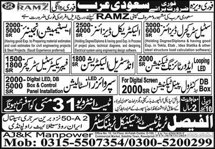 Al Faisal Trade Test & Technical Training Center Riyadh, taif Saudi Arabia invites applications from eligible candidates for the post of industrial electrician, fabricator steel structure, supervisor technician, led supervisor technician, control panel technician, estimation engineer, db box control panel technician, advertising technician, electrical designer and steel structural designer as per advertisement of May 29, 2025 published in daily Express Newspaper. Educational qualifications required B.E, DAE, Bachelor, Intermediate and Matric etc.
