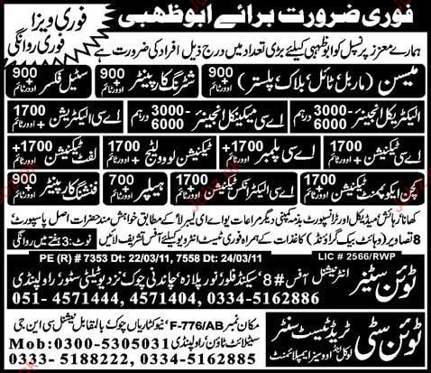 Electrical Engineer, AC Mechanical Engineer, Shuttering Carpenter, Steel Fixer, AC Electrician, AC Technician, AC Plumber, Lift Technician, Kitchen Equipment Technician, AC Electronics Technicians, Finishing Carpenter and Mason are Required i Abu Dhabi