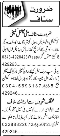 Private Company Lahore, lahore Punjab Pakistan invites applications from eligible candidates for the post of manager, electrical engineer, order taker, audit accountant, salesman, civil engineer, call operator, marketing manager, office boy, accountant, mechanical engineer, clerk and branch manager as per advertisement of May 21, 2024 published in daily Roznama 92 News Newspaper. Candidates with Intermediate, Matric, Master, Middle and Bachelor etc. educational background will be preferred.