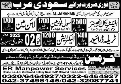 Vacant posts including civil foreman, electrical engineer, traila driver, electrician and line man are announced in ER Manpower Services Riyadh, riyadh Saudi Arabia as per 28 December 2024 advertisement in daily Express Newspaper. Candidates with Bachelor, Intermediate, Middle and Matric etc. educational background will be preferred.