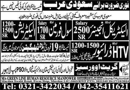 Ms Green Line Human Resource Manpower is looking for candidates for following posts as per job advertisement published in daily Express Newspaper of February 17, 2025 for location Riyadh, saudi arabia and riyadh Saudi Arabia: