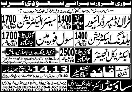 Sound Lines Recruiting Promotion jobs advertisement dated about 11 March 2025 in daily Express Newspaper invites application for the vacant post of civil foreman, traila driver, building electrician, electrician and electrical engineer in Riyadh, jeddah Saudi Arabia. Educational qualifications required Bachelor, B.E, DAE, Matric and Intermediate etc.