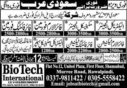 Bio Tech International jobs advertisement dated about 9 July 2025 in daily Express Newspaper invites application for the vacant post of mechanical engineer, mechanical helper, electrical helper, fire alarm foreman, fire fighting technician, electrical engineer, fire alarm technician and fire fighting foreman in Riyadh, jeddah Saudi Arabia. Preferred Education is Bachelor, Matric, Intermediate, B.E, DAE and Others etc.