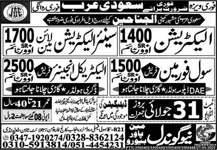 New Gondal Manpower Bureau Dammam, makkah Saudi Arabia invites applications from eligible candidates for the post of lineman, civil foreman, electrical engineer and electrician as per advertisement of July 29, 2025 published in daily Express Newspaper. DAE, Others, Intermediate, Bachelor and Matric etc. educational qualification will be preferred.