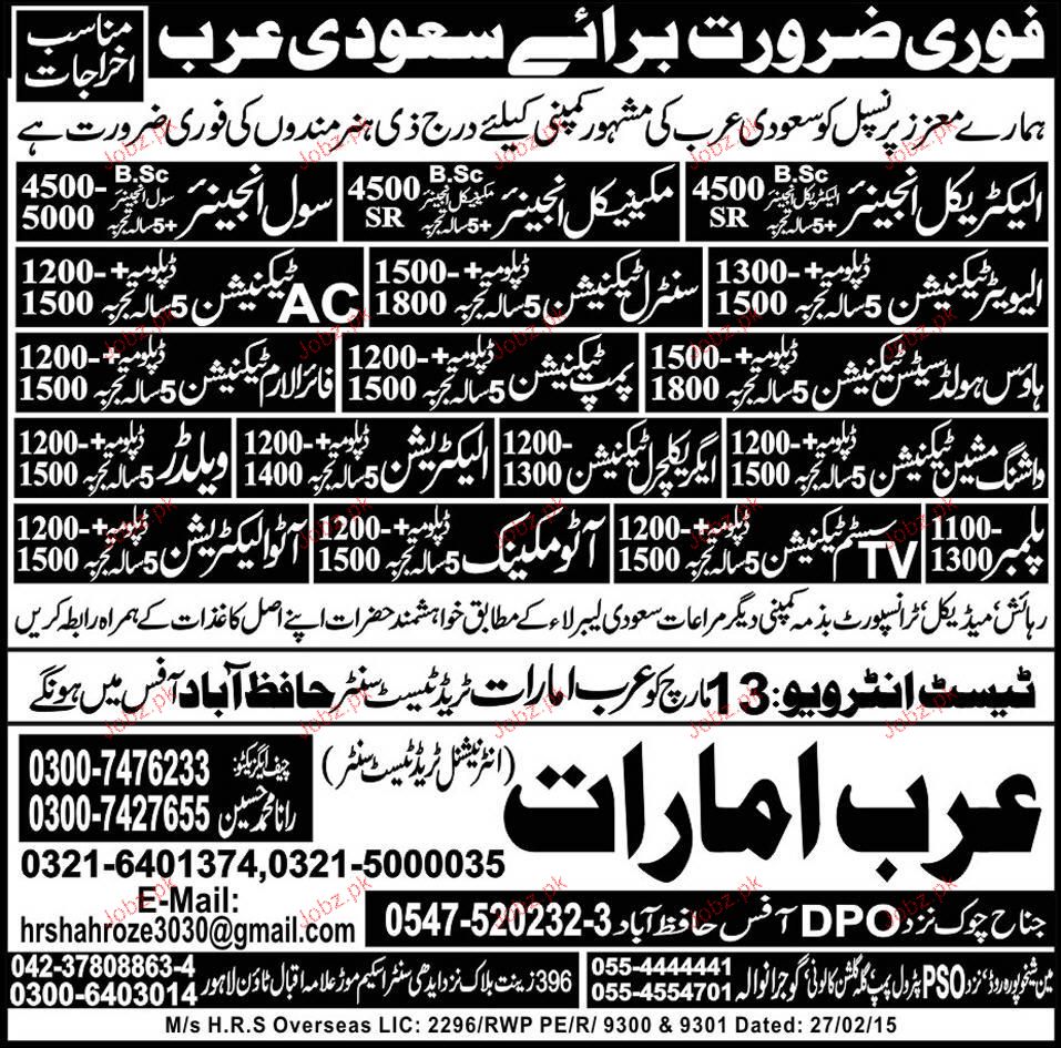 Electrical Engineers, Mechanical Engineers, Civil Engineers, Pump Technicians and Auto Electricians are required in Saudi Arabia.