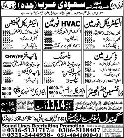Sound Lines Recruiting Promotion jobs advertisement dated about 9 August 2023 in daily Express Newspaper invites application for the vacant post of electrical draftsman, hvac foreman, electrical technician, qs electrical mechanical, chargehand plumbing, duct man, draftsman, foreman plumbing, pipe fitter technician, pipe fitter, engineer and electrical foreman in Jeddah, jeddah Saudi Arabia. Preferred Education is Bachelor, Matric, Intermediate and Middle etc.