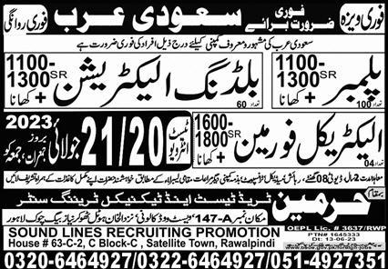 Vacant posts including plumber, electrical foreman and building electrician are announced in Harmain Trade Test & Technical Training Center Madina, dammam Saudi Arabia as per 13 July 2023 advertisement in daily Express Newspaper. Candidates with Matric, DAE and Intermediate etc. educational background will be preferred.