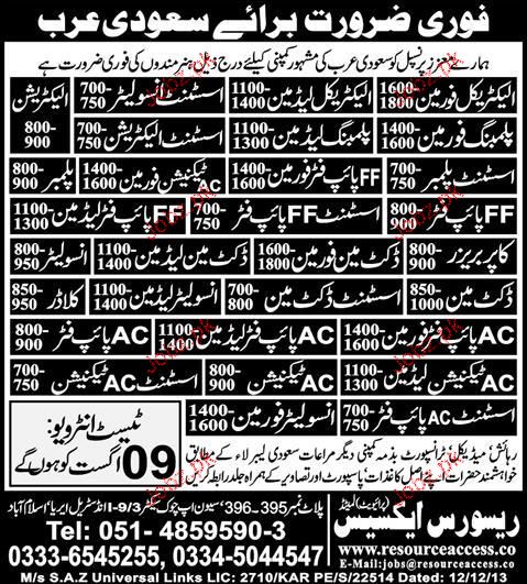 Electrical Foreman, Electrical Leadman, Assistant Insolaotrs, AC Technicians, Ductman, AC Pipe Fitters, AC Technicians and Insolators Foreman are required in Saudi Arabia.