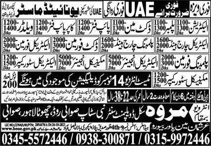 Marwa Skill Development Center Abu Dhabi, sharjah UAE invites applications from eligible candidates for the post of electrical foreman, electrical chargehand, docket foreman, docket man, chargehand plumbing, welder, electrician, electrical store keeper, electrical engineer, engineer, plumbing foreman, mechanical store keeper, copper pipe fitter, mechanical engineer, plumber and pipe fitter as per advertisement of November 9, 2023 published in daily Express Newspaper. Persons with Matric, Bachelor, DAE, B.E and Intermediate etc. education can apply.
