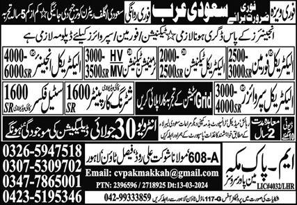 M Pak Makkah Manpower Services latest Overseas Engineering jobs and others can be applied till July 30, 2024 or as per closing date in newspaper ad. Read complete ad online to know how to apply on latest M Pak Makkah Manpower Services job opportunities. Earn extra money with overtime. On job medical, accommodation and transport facility is provided.