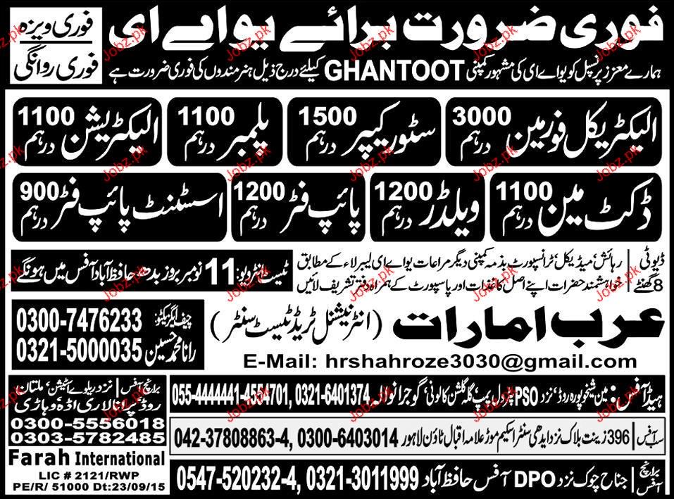 Electrical Foreman, Store Keeper, Pipe Fitters and Assistant Pipe Fitters are required in UAE.