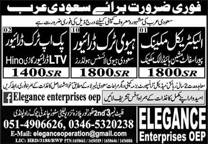 Elegance Enterprises jobs advertisement dated about 17 June 2023 in daily Express Newspaper invites application for the vacant post of electrical mechanic, pickup driver, ltv driver, truck driver, driver and heavy truck driver in Jeddah, riyadh Saudi Arabia. Intermediate and Matric etc. educational qualification will be preferred.