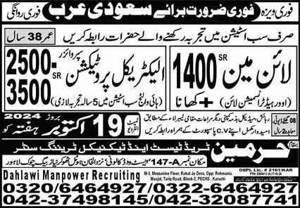 Vacant posts including lineman and electrical protection supervisor are announced in Harmain Trade Test & Technical Training Center Riyadh, dammam Saudi Arabia as per 18 October 2024 advertisement in daily Express Newspaper. Candidates with Intermediate, Bachelor, Matric, B.E and DAE etc. educational background will be preferred.