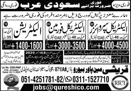 Qureshi Manpower Bureau jobs advertisement dated about 7 December 2025 in daily Express Newspaper invites application for the vacant post of electrical foreman, electrical supervisor and electrician in Riyadh, riyadh Saudi Arabia. Preferred Education is Middle, Intermediate and Matric etc.