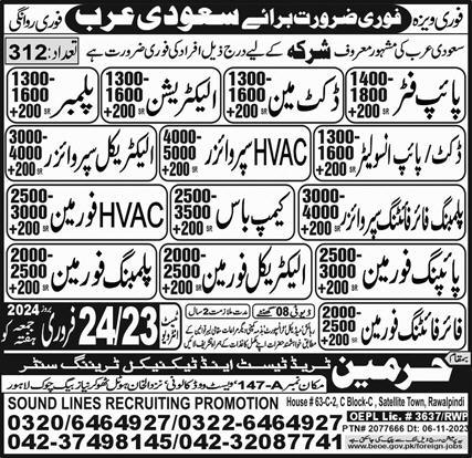 Vacant posts including electrician supervisor, hvac supervisor, camp boss, docket man, plumbing foreman, plumber, hvac foreman, plumbing fire fitter supervisor, piping foreman, fire fighting foreman, pipe fitter, docket insulator, electrician foreman, pipe insulator and electrician are announced in Harmain Trade Test & Technical Training Center Dammam, tabuk Saudi Arabia as per 14 February 2024 advertisement in daily Express Newspaper. Candidates with Bachelor, Matric, DAE, B.E and Intermediate etc. educational background will be preferred.