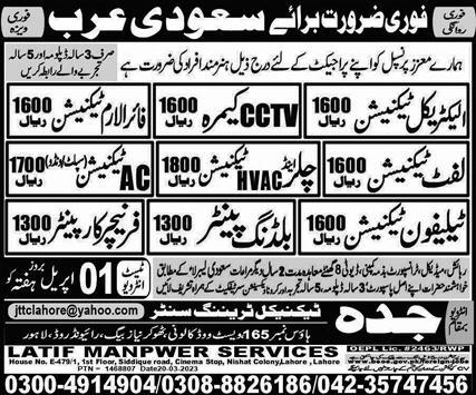 Vacant posts including hvac technician, chiller technician, fire alarm technician, electrical technician, building carpenter, lift technician, furniture carpenter, ac technician, telephone technician and cctv camera are announced in Jeddah Technical Training Center Saudi Arabia, makkah Saudi Arabia as per 26 March 2023 advertisement in daily Express Newspaper. Persons with Middle, Primary and Matric etc. education can apply.