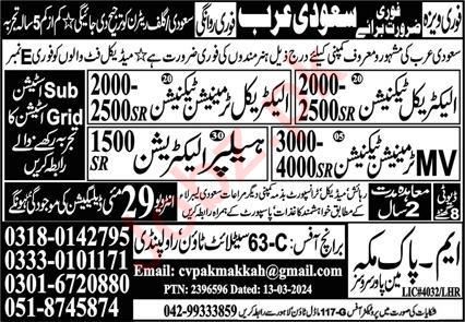 M Pak Makkah Manpower Services Riyadh, riyadh Saudi Arabia invites applications from eligible candidates for the post of helper electrician, electrical techician, mv termination technician and electrical termination technician as per advertisement of May 26, 2024 published in daily Express Newspaper. Persons with Matric and Intermediate etc. education can apply.