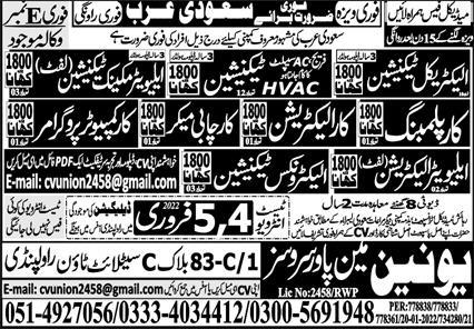 Union Manpower Services jobs advertisement dated about 3 February 2022 in daily Express Newspaper invites application for the vacant post of car key maker, car electrician, elevator electrician, elevator mechanic technician, lift technician, electronics technician, car computer programmer, hvac technician, car plumbing, lift electrician and electrical technician in Makkah Saudi Arabia. Educational qualifications required Intermediate, Matric and Middle etc.