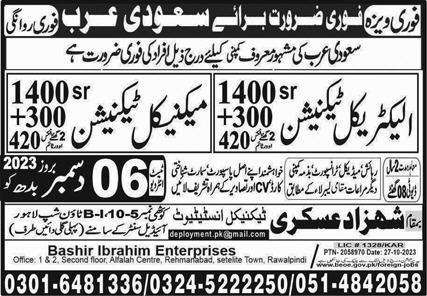 Shahzad Askari Technical Institute jobs advertisement dated about 2 December 2023 in daily Express Newspaper invites application for the vacant post of mechanical technician and electrical technician in Riyadh, jeddah Saudi Arabia. Matric, Intermediate and DAE etc. educational qualification will be preferred.