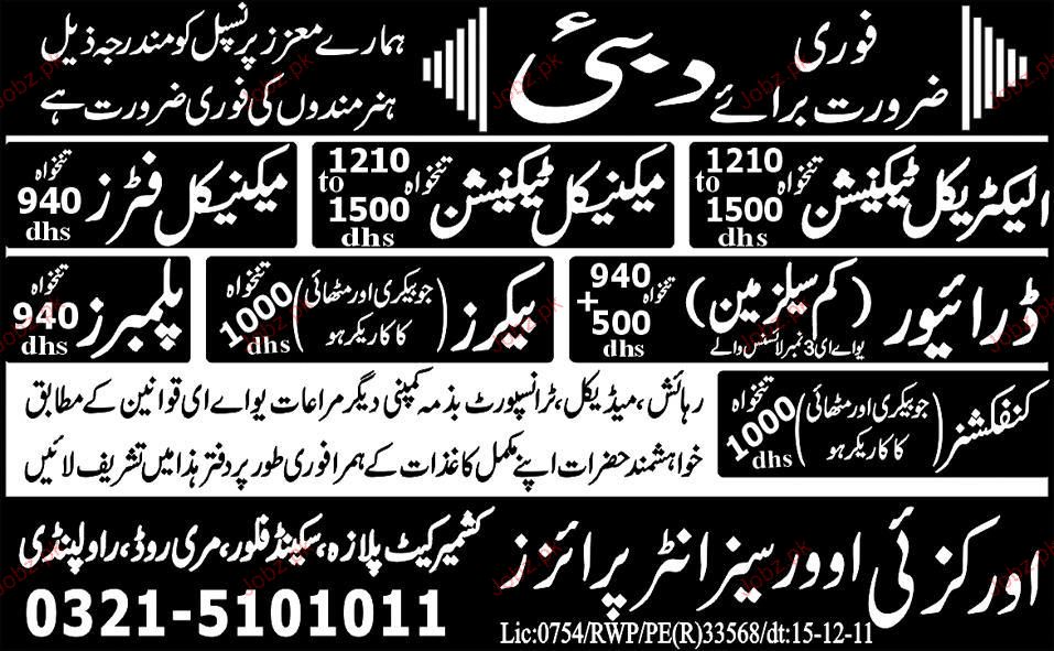 `Electrical Technicians, Mechanical Technicians, Mechanical Fitter, Drivers, Bakers and Plumbers are required in Dubai