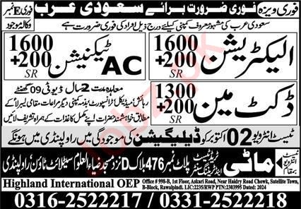 Highland International jobs advertisement dated about 29 September 2024 in daily Express Newspaper invites application for the vacant post of duct man, ac technician and electrician in Riyadh, riyadh Saudi Arabia. Persons with Matric, Intermediate and Middle etc. education can apply.