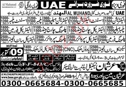 Vacant posts including electrical tool mechanic, assistant plumber, electrical charge hand, electrician, plumber helper, electrician helper, plumbing charge hand, assistant electrician, electrical foreman, electrical supervisor and plumbing supervisor are announced in Arshman Technical Trade Test & Training Center UAE, uae UAE as per 1 October 2023 advertisement in daily Express Newspaper. Middle, Matric and Primary etc. educational qualification will be preferred.