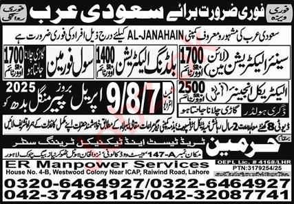 Vacant posts including electrician, building electrician, electrical engineer and civil foreman are announced in ER Manpower Services Riyadh, riyadh Saudi Arabia as per 6 April 2025 advertisement in daily Express Newspaper. Educational qualifications required Middle and Bachelor etc.