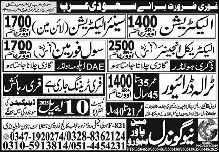 New Gondal Manpower Bureau is looking for candidates for following posts as per job advertisement published in daily Express Newspaper of March 30, 2025 for location Riyadh, riyadh Saudi Arabia: